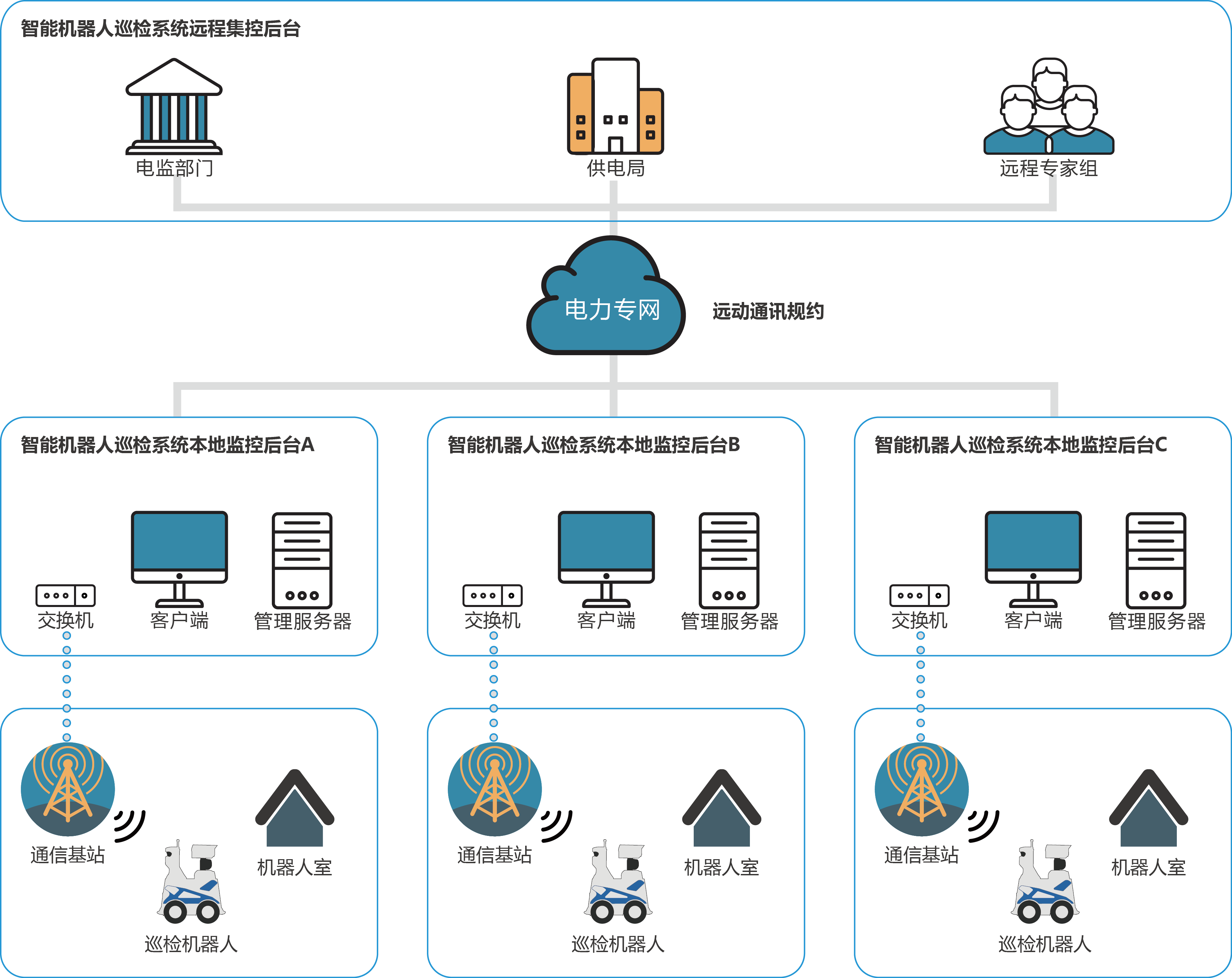 變電智能機器人巡檢系統(tǒng)由遠程集控后臺、本地監(jiān)控后臺、通信系統(tǒng)、機器人室和變電站智能巡檢機器人五大部分組成: