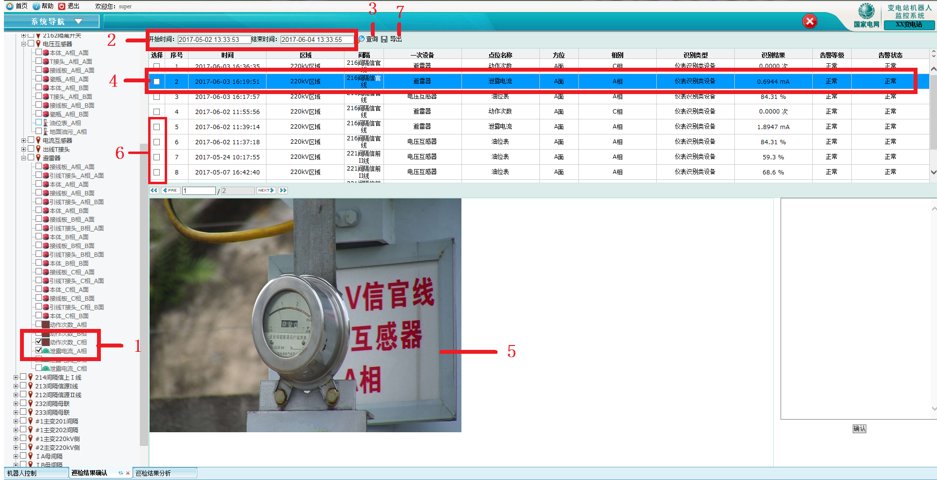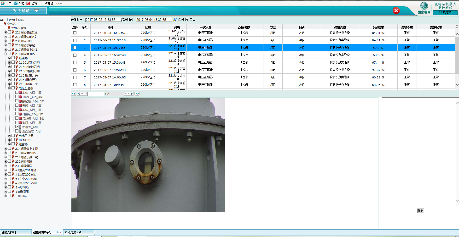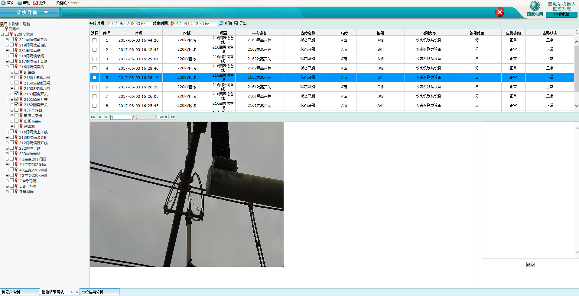 3)點(diǎn)擊『查詢(xún)』按鈕實(shí)現(xiàn)查詢(xún)將顯示所有的巡檢結(jié)果記錄,在下方頁(yè)面將顯示所有要搜索的巡檢信息(如巡檢時(shí)間、所在區(qū)域、間隔、一次設(shè)備、點(diǎn)位名稱(chēng)、方位、相別、識(shí)別結(jié)果、告警等級(jí)、告警狀態(tài));