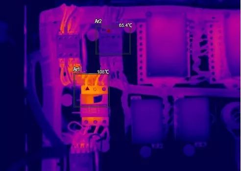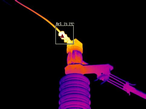 ▲刀閘紅外檢測,刀閘接頭C相出現過熱,最高溫度為71.7℃,正常相區(qū)A相溫度為31.6℃,經過計算,溫差為40.1k,相對溫差為85.6%,已屬于電流致熱型嚴重缺陷。