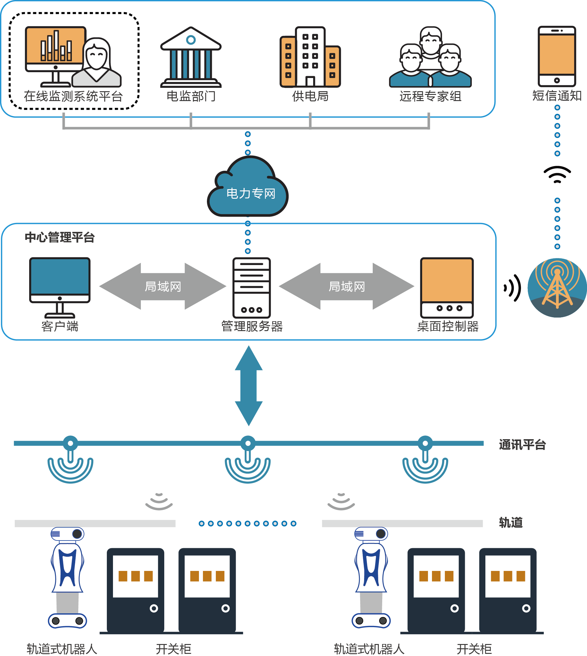 系統(tǒng)分為軌道式智能機(jī)器人巡檢和輪式智能機(jī)器人巡檢。機(jī)器人具有智能手動/自動巡檢、智能識別各類儀器儀表讀數(shù),準(zhǔn)確分析煙霧、溫濕度等環(huán)境信息,局放檢測,語音對講,24小時(shí)不間斷巡檢等功能,真正實(shí)現(xiàn)電力機(jī)房的智能巡檢。