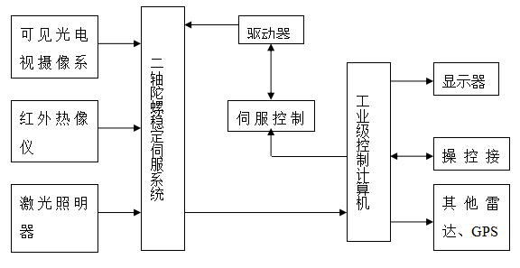 光電指向器采用球形結(jié)構(gòu),具有風阻小,抗風能力強的優(yōu)點;采用陀螺穩(wěn)定系統(tǒng)能夠有效地隔離因強風造成的安裝平臺搖擺,從而保持光電攝像系統(tǒng)的穩(wěn)定,得到清晰、穩(wěn)定的圖像,而且保證目標圖像始終在電視屏幕上而不丟失。
