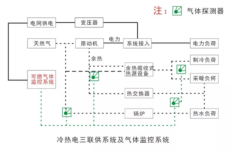 下圖為常規(guī)的冷、熱、電三聯(lián)供系統(tǒng)結(jié)合氣體監(jiān)控系統(tǒng)圖,該系統(tǒng)主要由原動(dòng)機(jī)為核心的發(fā)電設(shè)備、余熱回收設(shè)備、氣體探測器組成,與電網(wǎng)并網(wǎng)運(yùn)行。