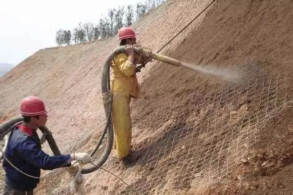 生態(tài)噴播技術(shù)就是利用活性植物材料,結(jié)合高強(qiáng)度土工格柵等工程材料,利用植生基材專用噴射裝置將攪拌均勻的植生基材按設(shè)計(jì)厚度噴射到巖石坡面上,在巖石坡面構(gòu)建一個(gè)具有自生長(zhǎng)的功能系統(tǒng),通過(guò)植物的生長(zhǎng)活動(dòng)和其它輔助工程措施進(jìn)行邊坡加固的一門(mén)高新技術(shù)。先用錨桿加固、土工格柵,增加土體內(nèi)聚力、提高土體抗剪強(qiáng)度以及保證土層厚度,利于邊坡基材穩(wěn)定;然后在上面噴撒上專門(mén)的植生基材,起到提高植物成活率為坡面復(fù)綠達(dá)到效果,從而讓峭壁穿上綠衣。