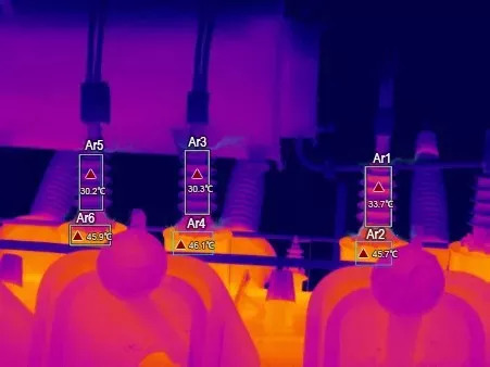 這種電壓致熱型極難發(fā)現(xiàn)。主要原因有3個(gè),其一:溫差太小,一般熱像儀很難發(fā)現(xiàn)如此小的溫差,而普通熱像儀的驗(yàn)收標(biāo)準(zhǔn)是允許溫差2度,這本身就已經(jīng)達(dá)到缺陷的閾值了;其二:套管在變壓器上,變壓器本身溫升很高,是一個(gè)強(qiáng)大的干擾源,很容易掩蓋套管本身存在的溫差;其三:對(duì)現(xiàn)場(chǎng)人員的技術(shù)要求較高,除現(xiàn)場(chǎng)查閱規(guī)范、計(jì)算溫度外,也需要他具備豐富的經(jīng)驗(yàn)和專業(yè)的故障判斷能力。