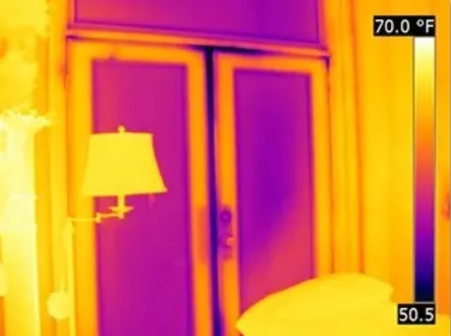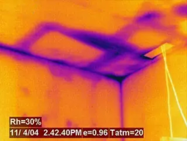 用于檢測空氣泄露點的常用方法是通過檢測空氣交換率并采用一種被稱為“風門”的檢測過程。在該過程中,房屋內會產(chǎn)生負壓。此時,室外的壓力大于室內的壓力,因此,空氣將會從密封不嚴的區(qū)域進入。紅外熱像儀能夠快速檢測到流動的氣流,密封不嚴的區(qū)域就可以很方便地被加以識別,并且在完成下一步工序之前解決問題,從而避免由潛在的施工問題變成花費昂貴的棘手問題。