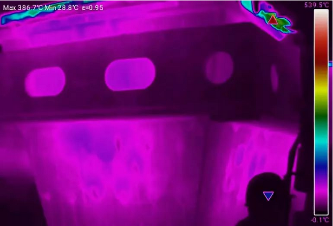 事實(shí)告訴我們,中間包發(fā)生穿包事故前,中間包外部鋼殼溫度會(huì)發(fā)生異常升高。穿包事故是一個(gè)動(dòng)態(tài)過程,并非突然發(fā)生。在這個(gè)動(dòng)態(tài)過程中,紅外熱像儀可對(duì)中間包實(shí)時(shí)監(jiān)控,通過熱圖熱梯度變化和溫度趨勢(shì)提前預(yù)警!
