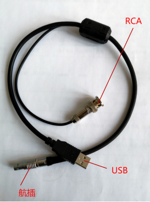 如圖所示,航插接口與設(shè)備相連,數(shù)據(jù)連接線上有2個(gè)功能接口,分別為USB接口,模擬視頻接口。