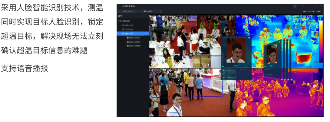 紅外熱成像非接觸人體測溫通過測溫型熱成像與可見光智能人臉識別算法技術(shù)相結(jié)合,被檢測者在離檢測設(shè)備1~8米處接受體溫檢測,不易引起被檢測者的反感和恐慌,檢測人員可在遠(yuǎn)程快速進(jìn)行人體測溫篩查,確定超溫人群,從而實(shí)現(xiàn)潛在疫情人員的隔離。在流行性傳染病爆發(fā)期實(shí)現(xiàn)早發(fā)現(xiàn)、早隔離,克服了傳統(tǒng)的體溫計(jì)、額溫計(jì)、點(diǎn)溫計(jì)和耳溫計(jì)等僅針對個(gè)體測量,耗時(shí)多、易交叉感染等不足,從而可有效的控制疫情擴(kuò)散,減少人員傷亡,非