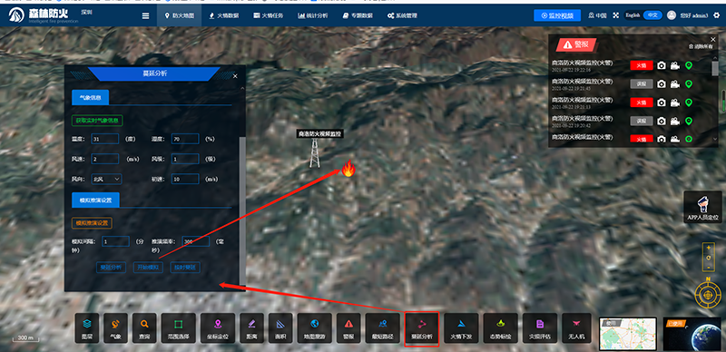 2、火勢蔓延分析:根據(jù)森林資源的分布數(shù)據(jù)、分布范圍、風向、風速、地面溫度、濕度以及當前過火面積和范圍的動態(tài)數(shù)據(jù),實時動態(tài)估算蔓延火勢對火燒地區(qū)的摧毀時間等